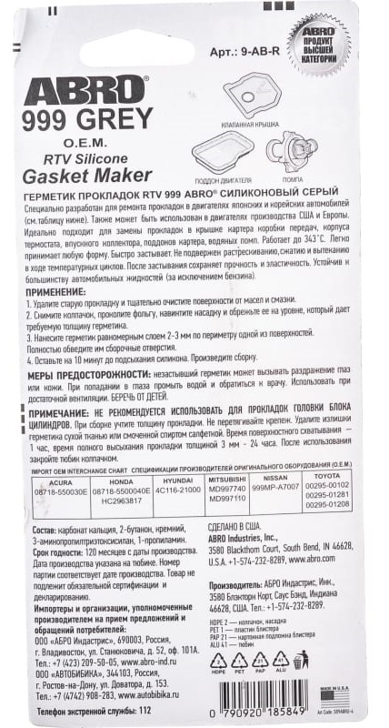 Герметик прокладка ABRO серый фирменный 85г 9AB