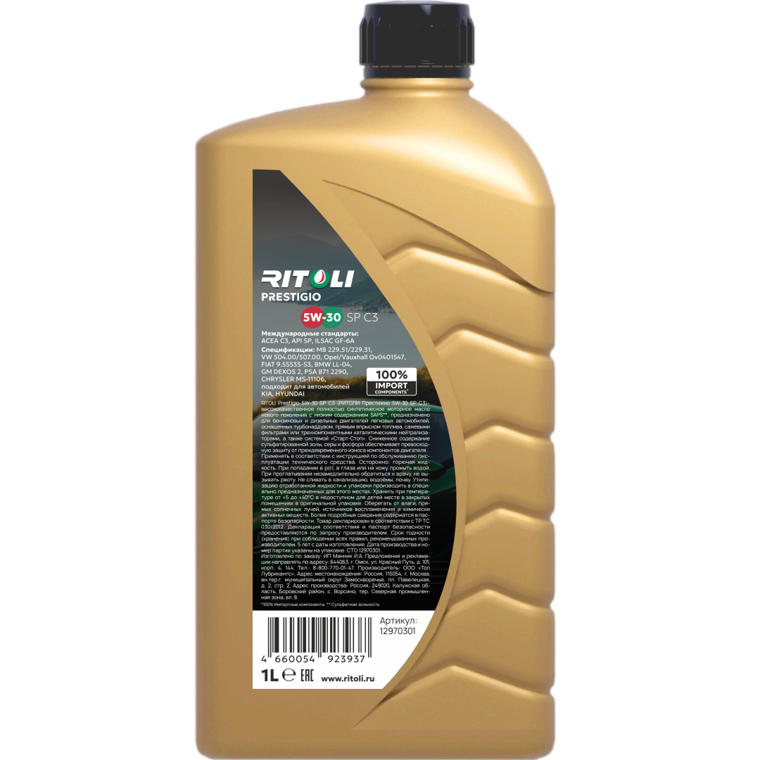 RITOLI Prestigio 5W-30 SP C3 (РИТОЛИ Престижио 5W-30 Эс-Пи C3) — высококачественное полностью синтетическое моторное масло нового поколения с низким содержанием SAPS, предназначено для бензиновых и дизельных двигателей легковых автомобилей, оснащенных турбонаддувом, прямым впрыском топлива, сажевыми фильтрами или трехкомпонентными каталитическими нейтрализаторами, а также системой «Старт-Стоп».